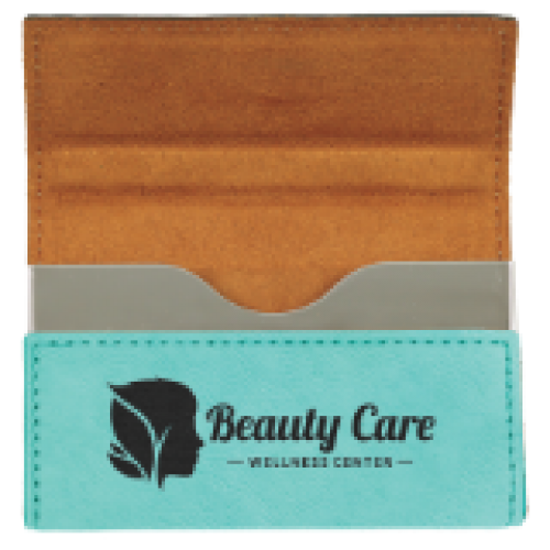 This is a teal leatherette business card holder.