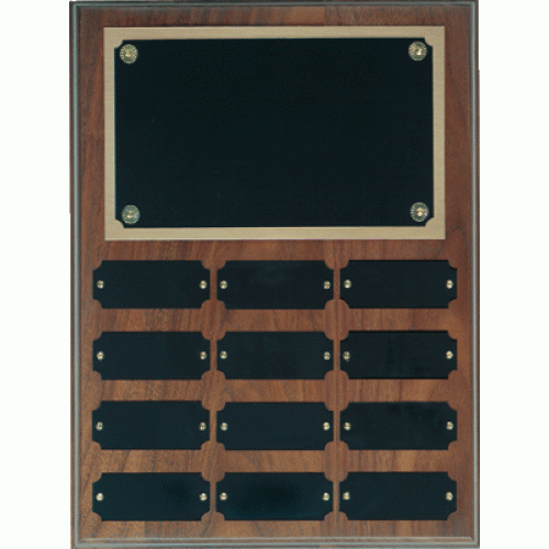 This is a walnut perpetual plaque that comes with 13 individual plates, a header plate, and a 4"x 6"..