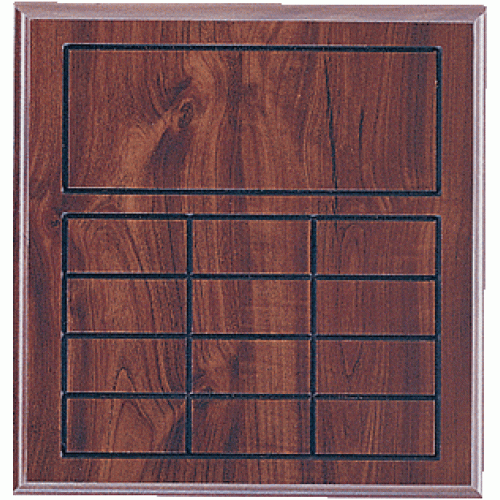 This is a walnut perpetual plaque that comes with 13 individual plates, a header plate, and a 4"x 6"..