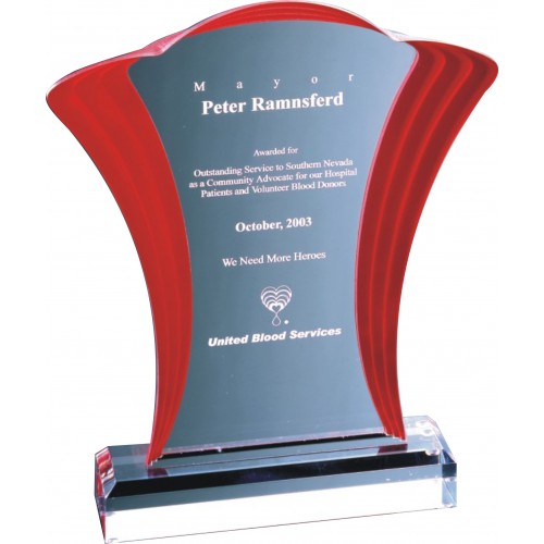 This award is a double zenith acrylic with a red mirrored base.Measures as 7" wide x 9.5" tall x 1/2..