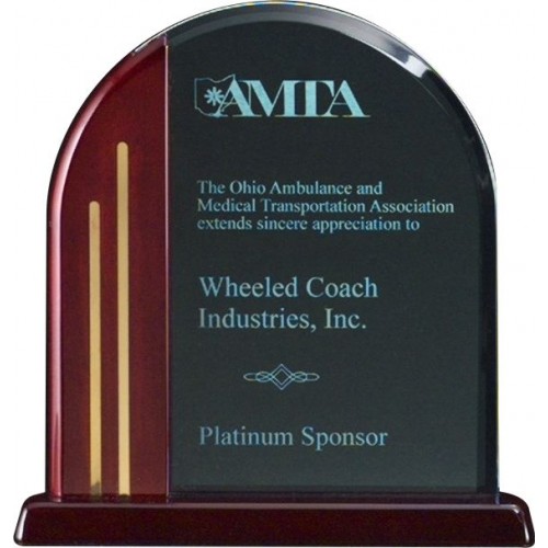 This piece is a Flame Series, jade acrylic award on a shiny, rosewood stained, piano finish base wit..
