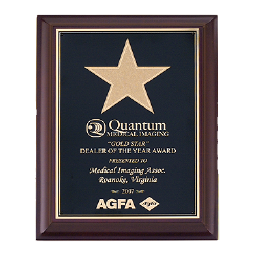 This is a cherry, wooden plaque with a laserable, gold plate. Measures as 9" wide x 12" t..