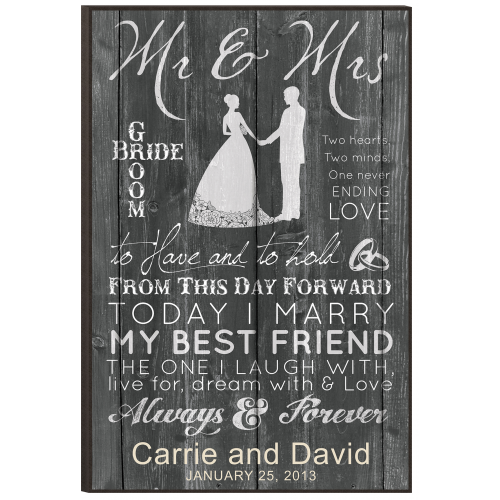 Our personalized Mr. & Mrs. Wedding Plaque celebrates love and happiness. This plaque features a chalkboard-style design with cute quotes from traditional and modern vows. It's a perfect gift for the newlyweds or a couple celebrating an anniversary. Equipped with pocket mounts for easy wall hanging.
