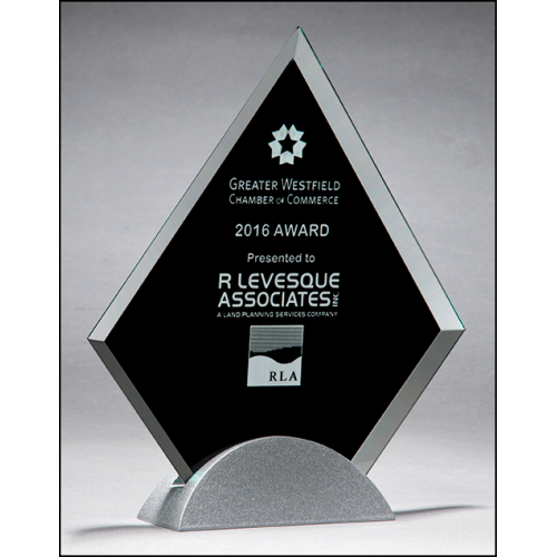 This piece is a jade, glass award silk screened black shaped as a diamond on a silver aluminium base.