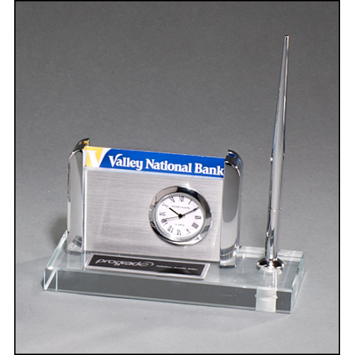 Clock, pen and business card holder on clear 1" thick glass base. Clock features lifetime guaranteed quartz movement. Battery included.