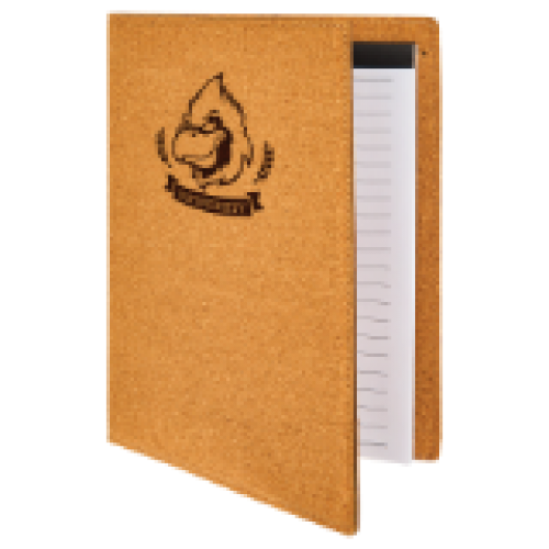 This is a cork, engravable leatherette portfolio with a notepad inside.