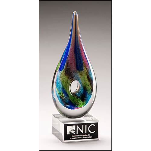 This award is a multi-colored, tear drop shaped art glass with a clear glass base.