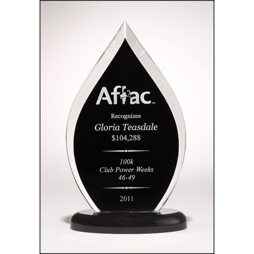This award is a Flames Series clear acrylic with a black screened back on top of a black acrylic base.